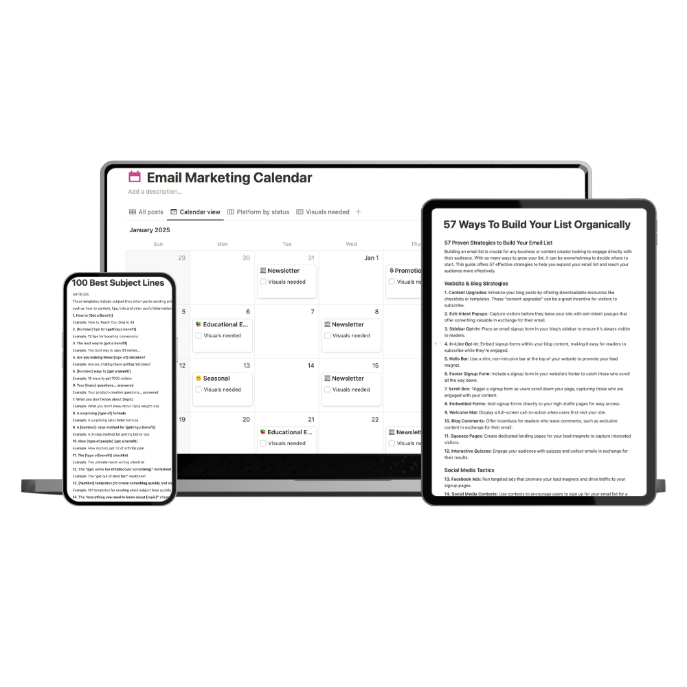 Built as the perfect companion to the book, this Notion-based workbook is packed with everything you need to get started with email marketing like a pro: